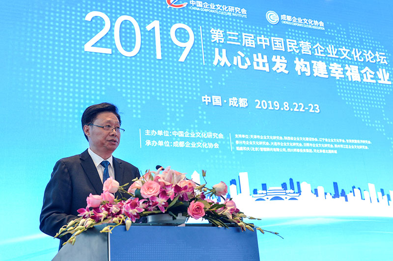2019年8月22-23日,由中国企业文化研究会主办、成都企业文化协会承办的第三届中国民营企业文化论坛在成都召开,中国企业文化研究会理事长孟凡驰,第十一届全国工商联副主席、中国民营经济研究会会长庄聪生,成都市委宣传部副部长扬晓阳,成都市政协原副主席、成都市工商联原主席郑吉光,成都市工商联巡视员韩路贤,成都企业文化协会许晓舟会长,成都企业文化协会副会长周永章等领导,来自全国各行业的企业代表和新闻媒体410多人参加了论坛。